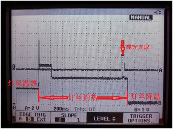 如下图所示,图中B是灯丝电流,A是曝光KV。灯丝灼热1.4后,曝光完成,然后灯丝电流立即降低到0,灯丝冷却。总的灯丝灼热时间大约是1.5秒。