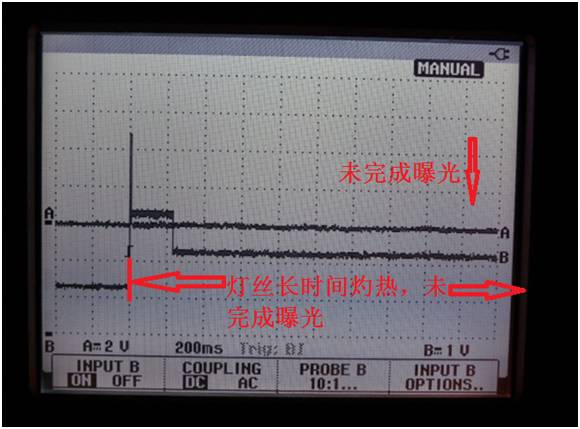 下图是手闸卡滞时的波型,由B可见,球管灯丝在白白加热,A始终是0 KV,未进完成曝光。球管灯丝加热时间已经超出了示波器所设量程,严重损耗了球管寿命。