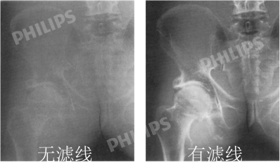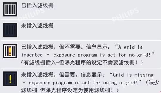 滤线栅在滤除散射线的同时也过滤掉了一些有用射线,所以使用滤线栅曝光时要求的剂量会稍高一些,平衡剂量和图像质量后一般像四肢这些比较薄的位置因为散射线较少,并不需要使用滤线栅。Philips DR的滤线栅都是可以拆卸的,虽然装不装滤线栅设备都可以曝光,但在操作界面有相应的滤线栅状态的指示。
